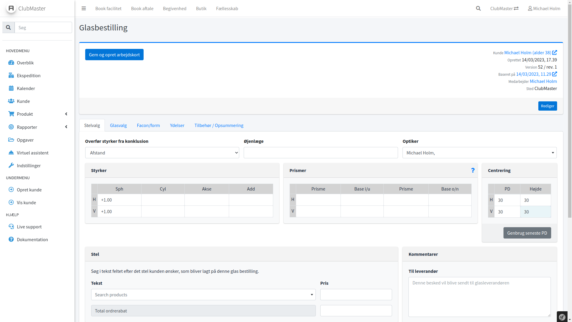 Når du skal oprette en glasbestilling, skal du igen være på vedkommendes kundekort, klikke på »Journal/noter« og denne gang vælge “Opret glasbestilling”.