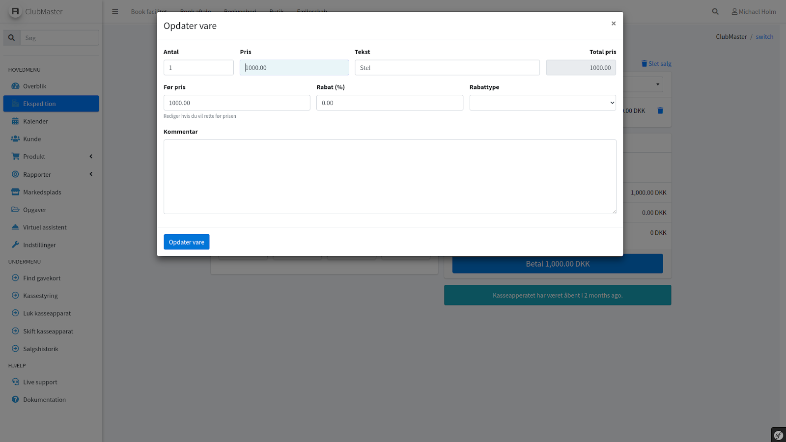 Rediger et produkt, eller giv en rabat ved at klikke på produktet i højre side af skærmen med produktets navn.