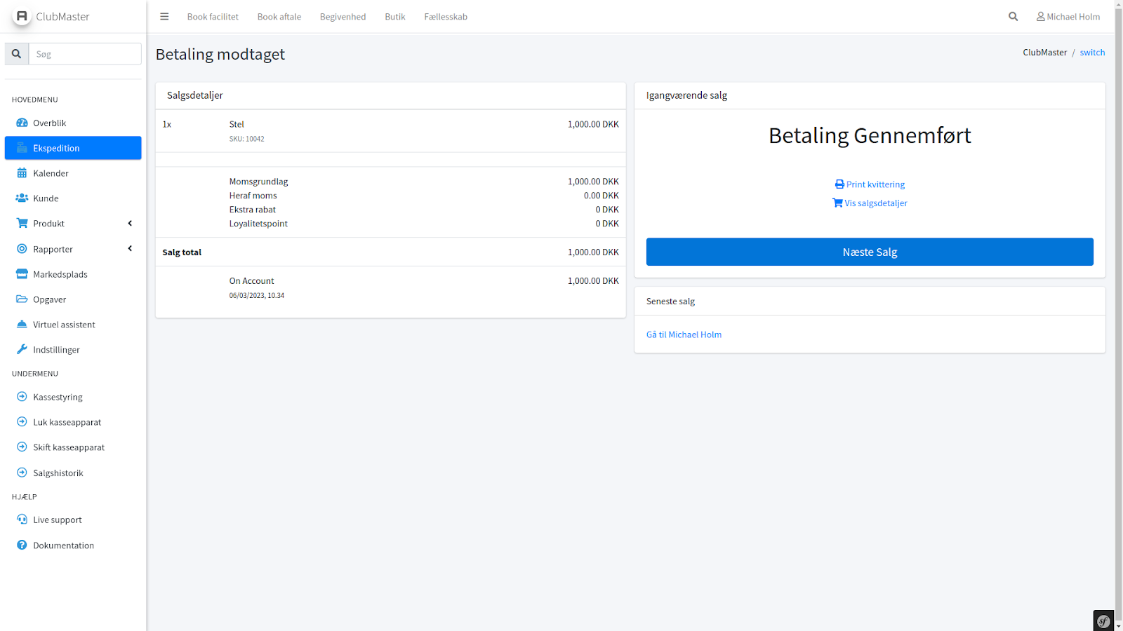 Derefter er salget færdigt, og der kan printes en kvittering, hvis ønsket. Ellers kan der klikkes på “Vis salgsdetaljer”, hvis kunden ønsker at få tilsendt faktura via email.