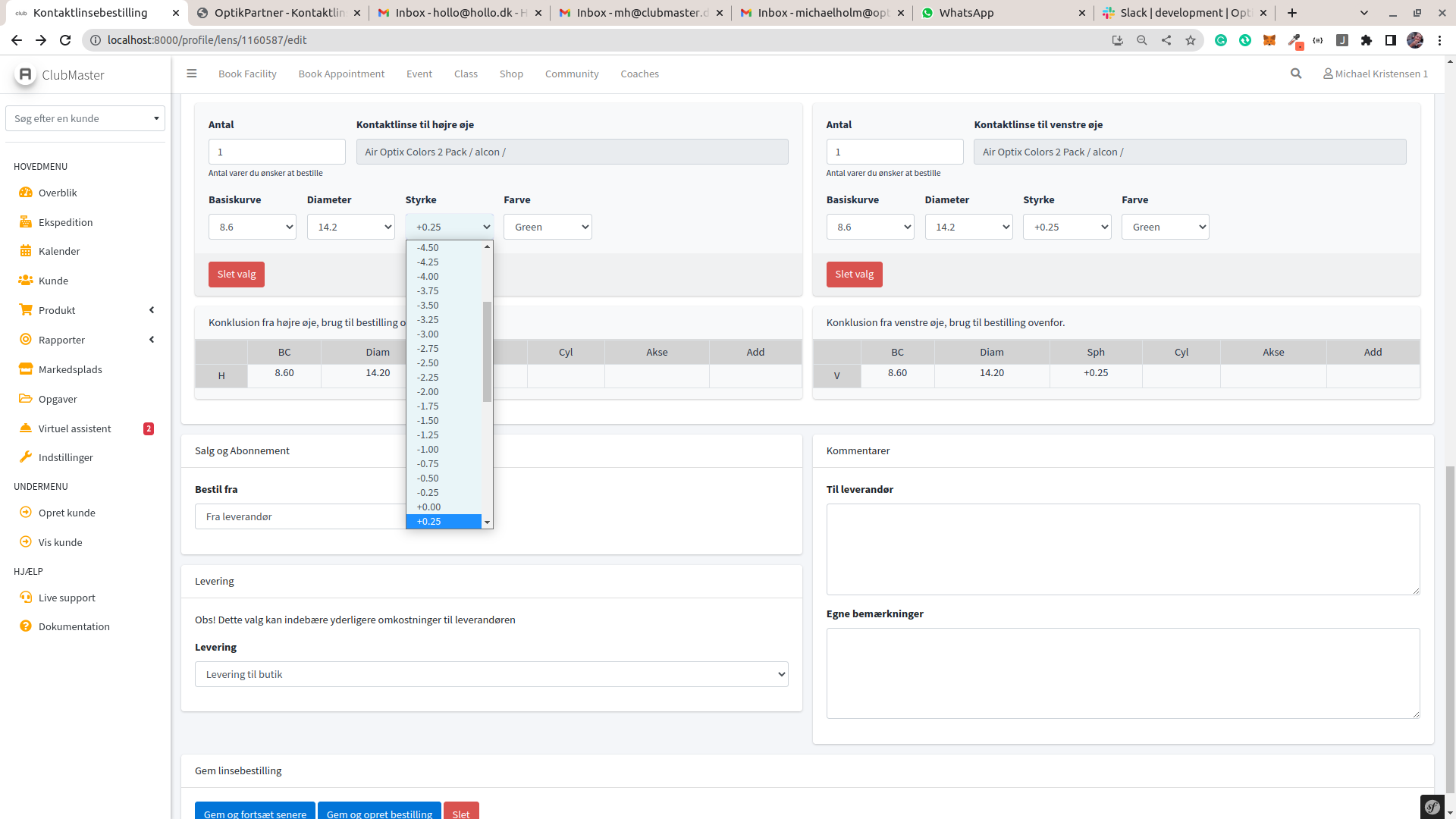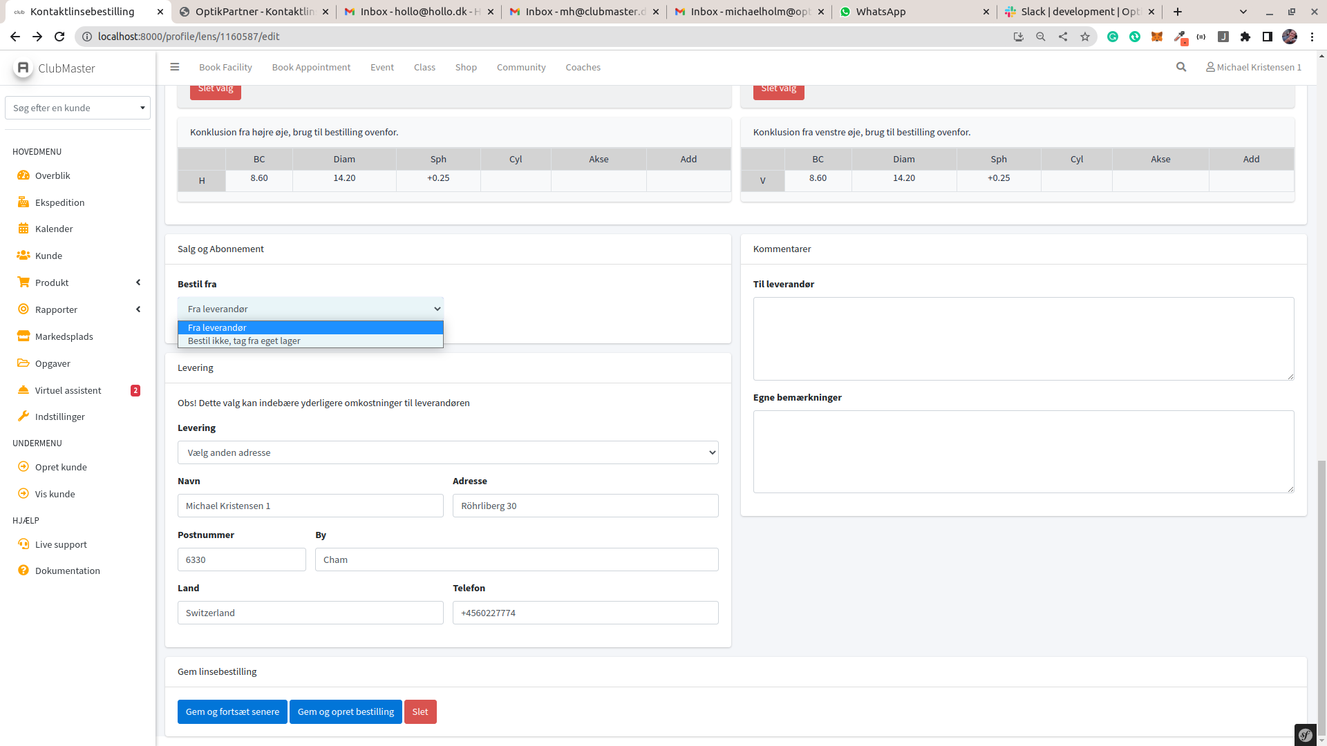 Lige under i boksen Levering kan du vælge om du ønsker levering til butikken, eller om linserne skal sendes hjem til kunden.