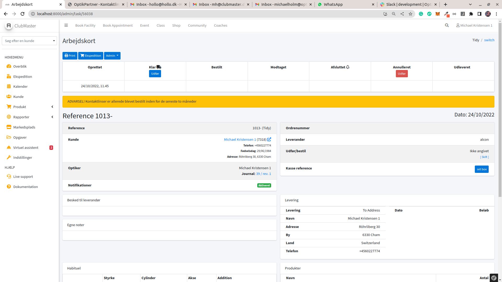 Når det hele er klar til kunden, klikker du på Udfør ud for afsluttet, og vi sender en notifikation til din kunde om linserne er klar og de kan komme og hente dem.