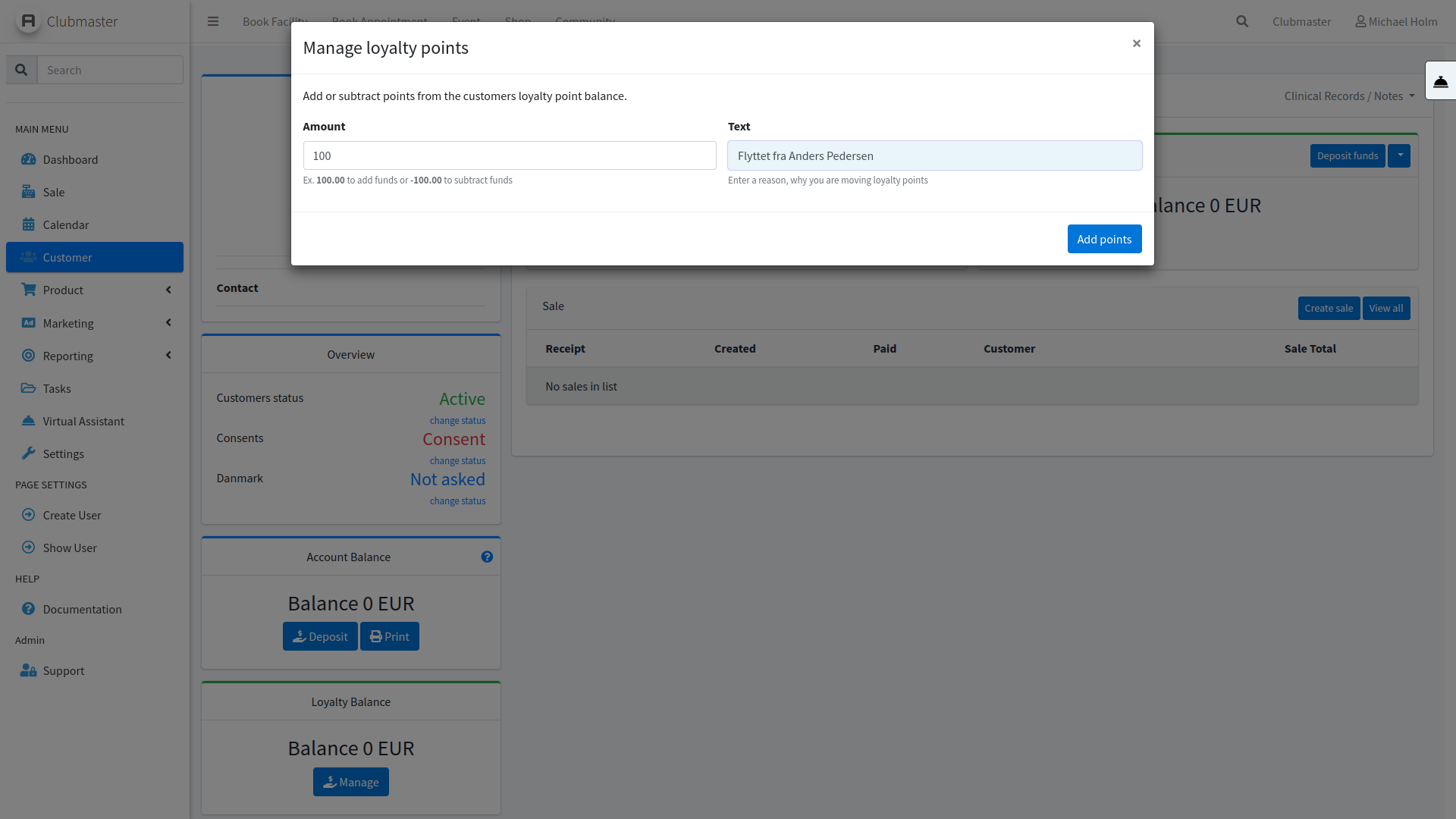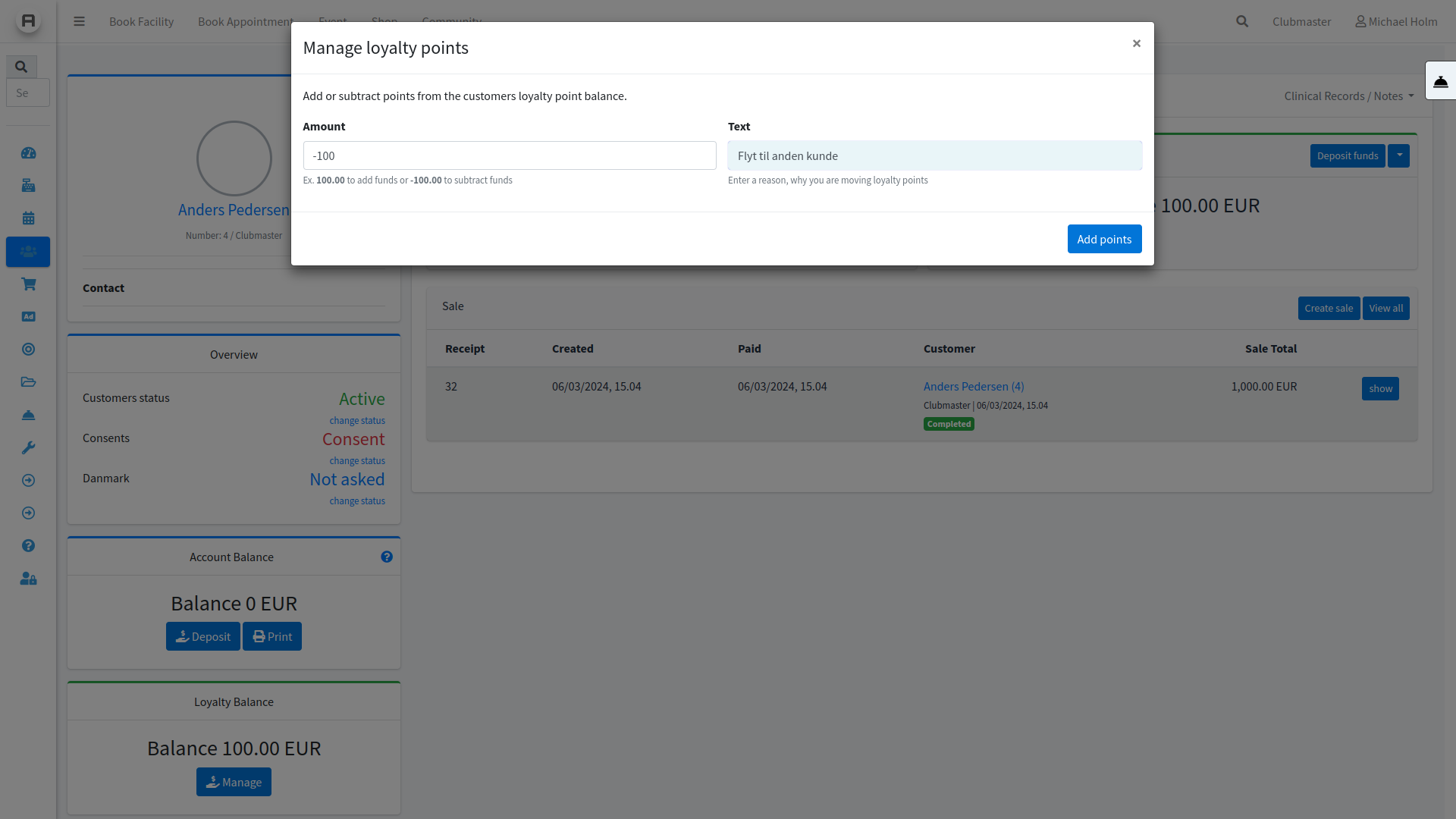 Hvis du ønsker at fjerne 100 point, så skriv -100 i beløb, og skriv et notat i feltet Tekst, så andre ved hvorfor pengene er flyttet.